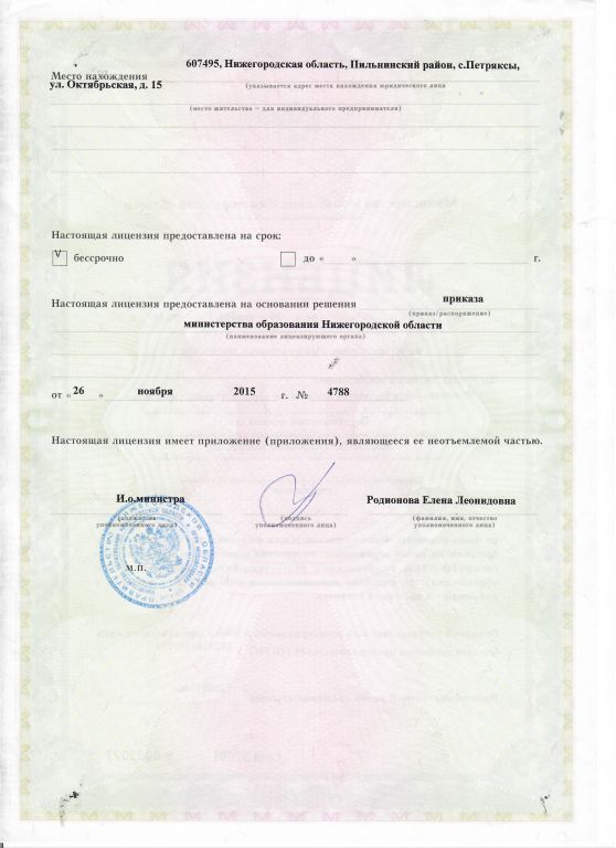 Адрес местонахождения образовательной организации* 607495,Нижегородская обл.. Пильнинский р-он, с.Петряксы,ул.Октябрьская, д. 15